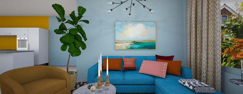 Omdat de helft van de woonkamer licht en luchtig is en de andere helft warm en donker, zou ik proberen te zorgen voor nog meer eenheid door met kleur te spelen. Als het een mogelijkheid zou zijn zou ik de kachel in een kleur schilderen / bekleden die in de woonkamer voorkomt, zoals de zachte zandkleur. Het keukeneiland zou ook meer betrokken kunnen worden bij de woonkamer door de voorkant in bijv. lichtblauw of zand te schilderen. Om meer eenheid te creëren zou meer met de kleuren gedaan kunnen worden van de vloerkleden en accessoires. Voer je palet door voor eenheid en rust.
